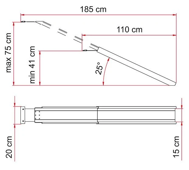 The rail can reach a length of 175 cm through the telescopic slide. With 2 pieces of Carry-Ramp you can create a system of ramps for loading scooters and wheelchairs. The 2 ramps hold up to 130 kg, do not load wheelchairs when occupied.