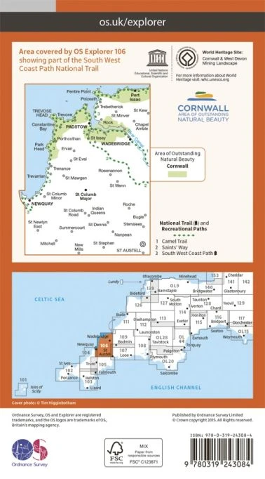 Map sheet number 106 in the OS Explorer map series is the ideal map for anyone wishing to visit the Cornish coastal towns of Newquay and Padstow. The area is famous amongst holidaymakers and is frequented by hikers, surfers and people wishing to sample the delights of the local towns and villages. Highlights of the area include: The Camel Trail, Newquay Harbour, Padstow, and Constantine Bay.