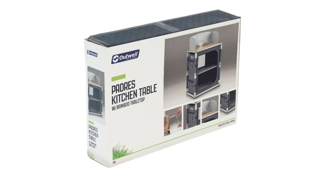 In a stylish black/grey fabric with a solid bamboo table top, this Outwell Padres Kitchen Table features three handy hooks on one side and a storage pocket on the other.