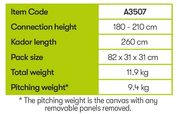 This pole system is quick to put together, lightweight and adjustable to help ensure the best pitching even on uneven ground. The pitching is easy enough to be done by a single person if required.