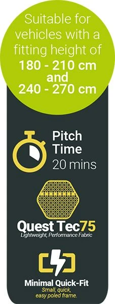 It uses the modern Quest Tec75 fabric which is lightweight, quick-drying and extremely waterproof making the awning easier to use and maintain. It is U.V. coated to help protect it from the harmful UV rays which helps extend its lifespan and gives you a U.P.F. rating of 50+ which is the highest possible giving you complete protection.