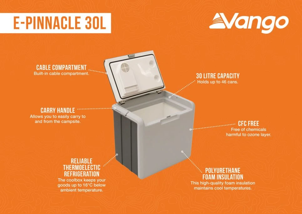 The Vango E-Pinnacle 30 litre mains and 12V electric cool box can be powered either from AC -230V mains or by a DC -12V in car socket. The cool box is able to cool up to 16 degrees C below the ambient temperature ensuring that your food and drink supplies are kept cool even on a warm day.Â